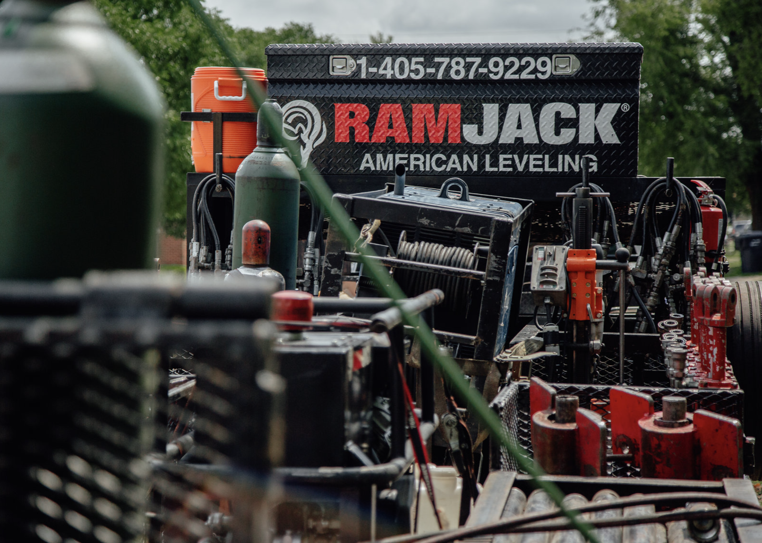 A Ram Jack American Leveling work trailer is fully loaded with hydraulic equipment, gas tanks, and tools, ready for a foundation repair job.